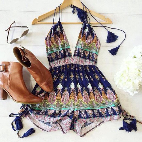 with backless and deep v-neck design. Chic floral print pattern makes it look more sweet.