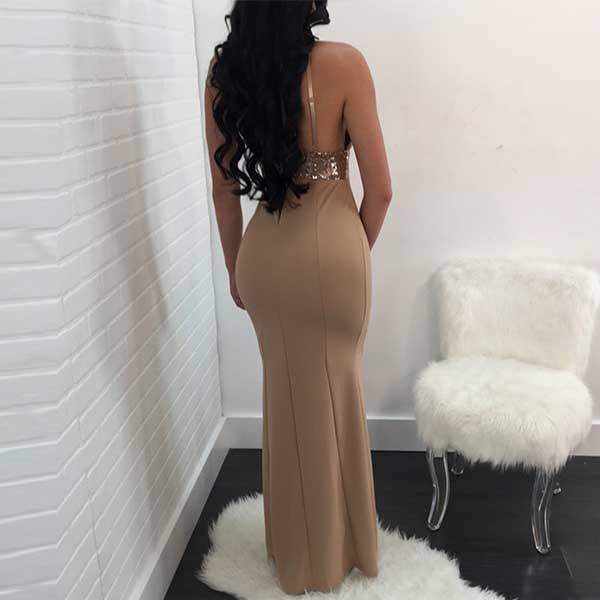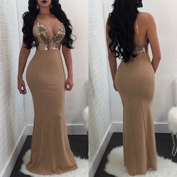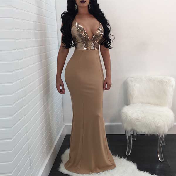 its stunning details like backless,deep v-neck and sequin spliced design make this piece look so sexy