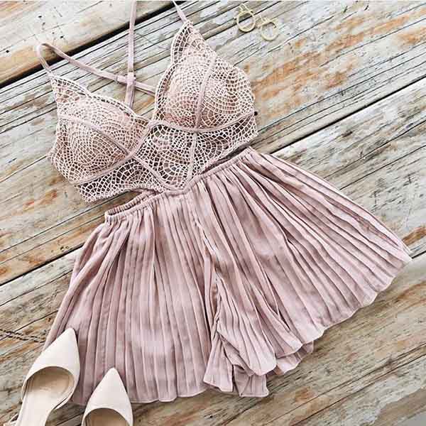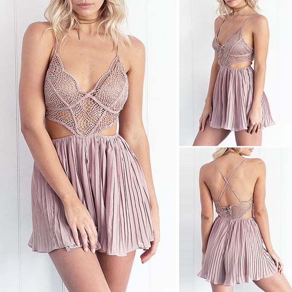 Say hello to your new favorite instant outfit! Sling style,with backless,deep v-neck and hollow out lace spliced