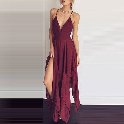 with backless,deep v-neck,irregular hem with slit design,this dress of course will give you an alluring look. Maybe you