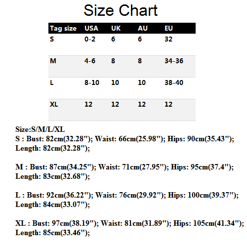 XL : Bust : 97cm(38.19"); Waist : 81cm(31.89"); Hips : 105cm(41.34"); Length : 85cm(33.46");