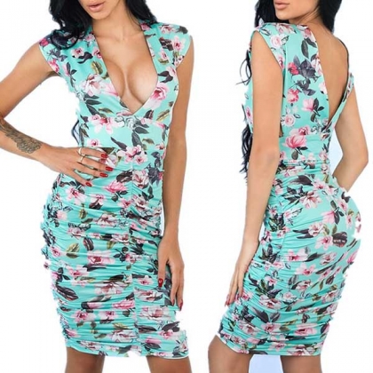 Sexy Backless Deep V-neck Slim Fit Wrinkled Printed Dress