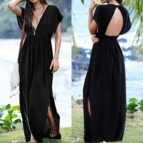 with the elegant and mysterious black tone complemented with backless,deep v-neck and slit hem,this dress