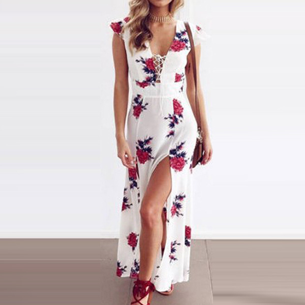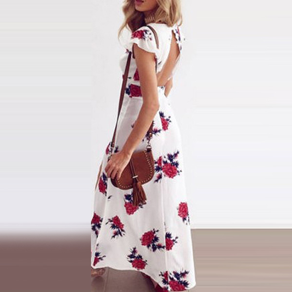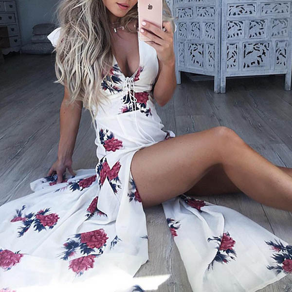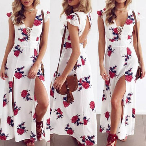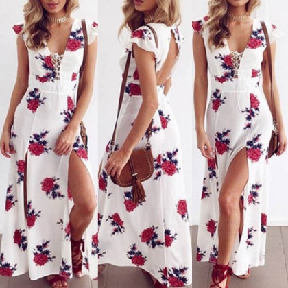 printed pattern,the stunning details like backless,lace-up deep v-neck and slit hem design make this