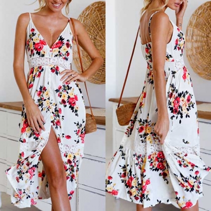 with backless,deep v-neck and slit hem design,sexy and alluring. And the lace spliced design can