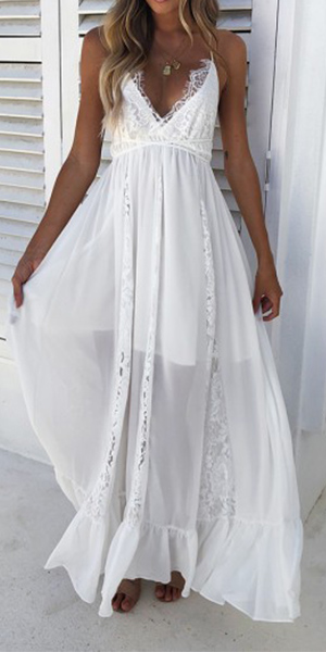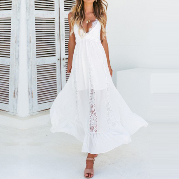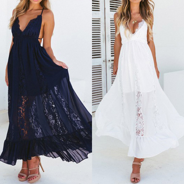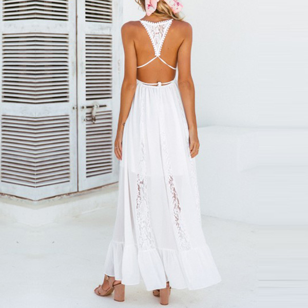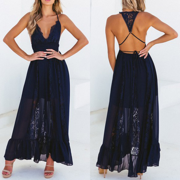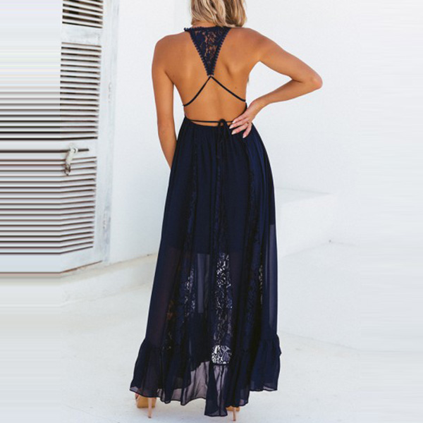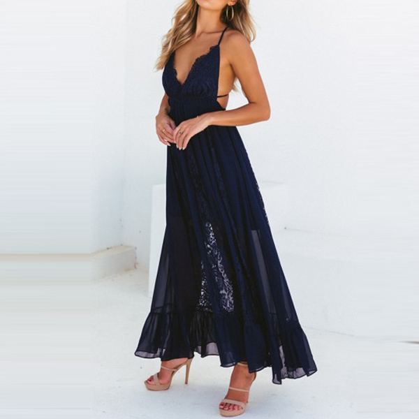 Sexy Backless Deep V-neck Slit Hem Lace Sppliced Sling Dress