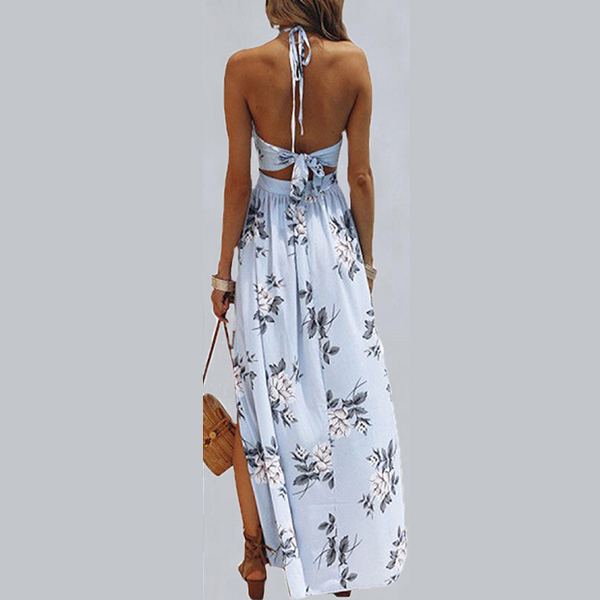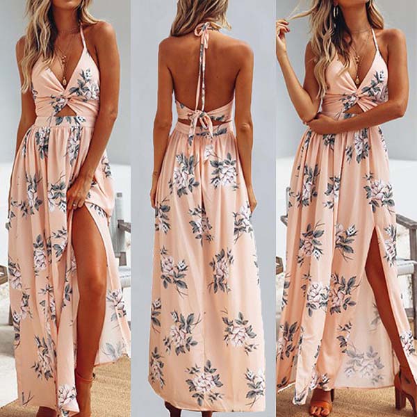 A pleasant sight will appear when you wear this alluring dress. Sling style,designed with backless,deep v-neck and slit hem,