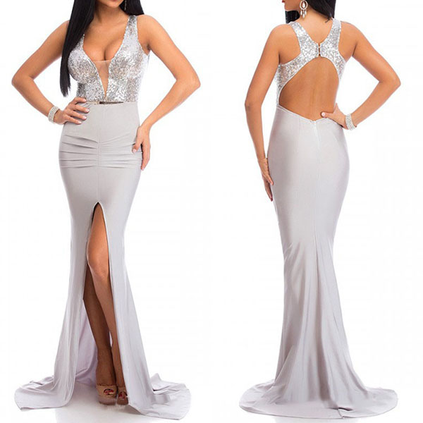 details like backless,deep v-neck,floor-length hem and sequin spliced design make this dress so gorgeous