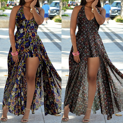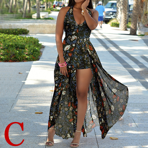 floral print,outfitted with backless,deep v-neck and slit hem spliced design,this romper can make you look