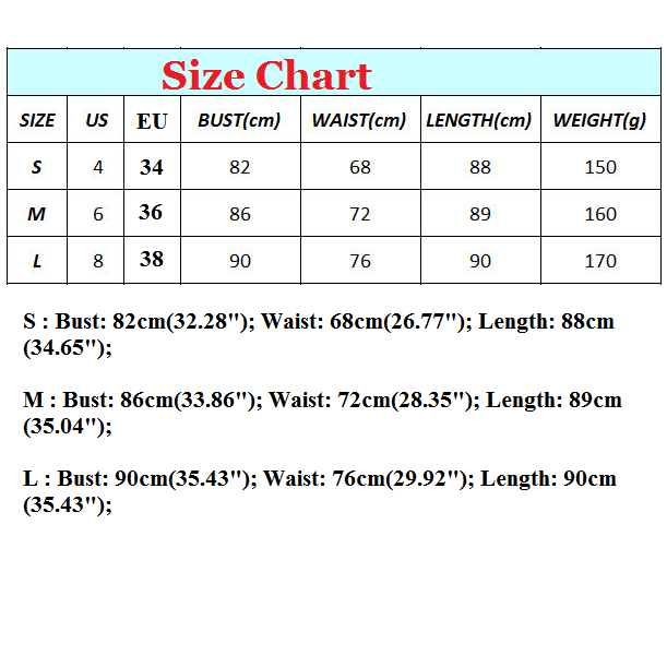M : Bust : 86cm(33.86"); Waist : 72cm(28.35"); Length : 89cm(35.04");