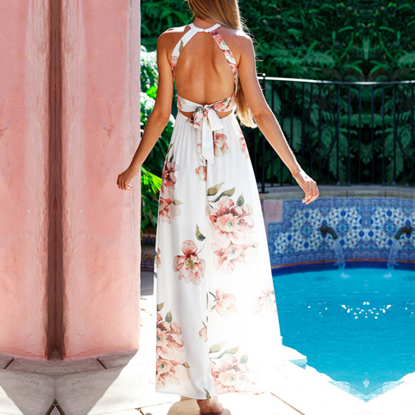 Its eye-catching floral print design makes it more matching with the seaside,while the backless and high slit hem