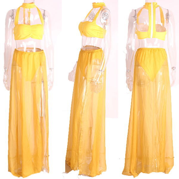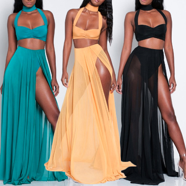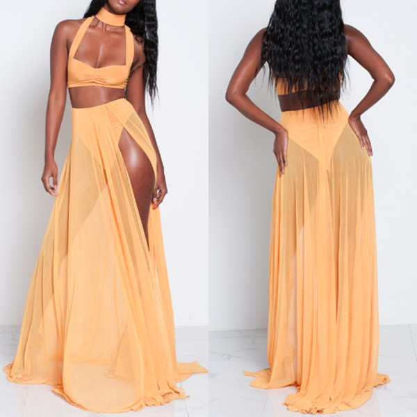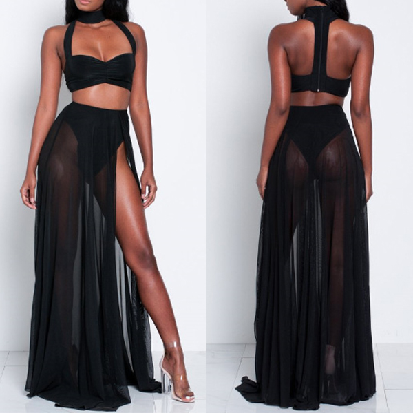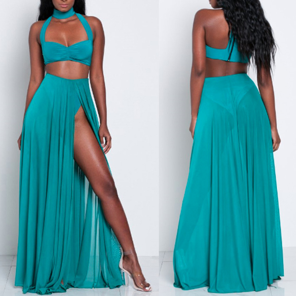 two-piece set. Solid color style,including a backless hollow out crop top and a high waist slit hem maxi skirt,this two-piece set