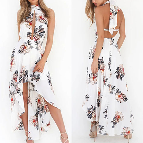 Insert a breathe of romance demurity into your date nights when opting for this dress. Lace-up halter style with backless design