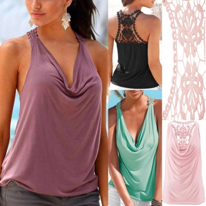 Sexy Backless Lace Spliced Cowl neck Sleeveless Tops