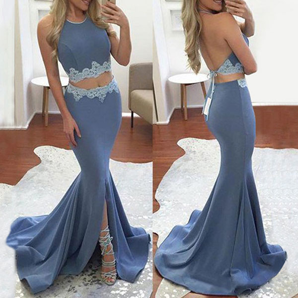 Including a backless halter crop top and a high waist floor-length skirt,with lace spliced design,