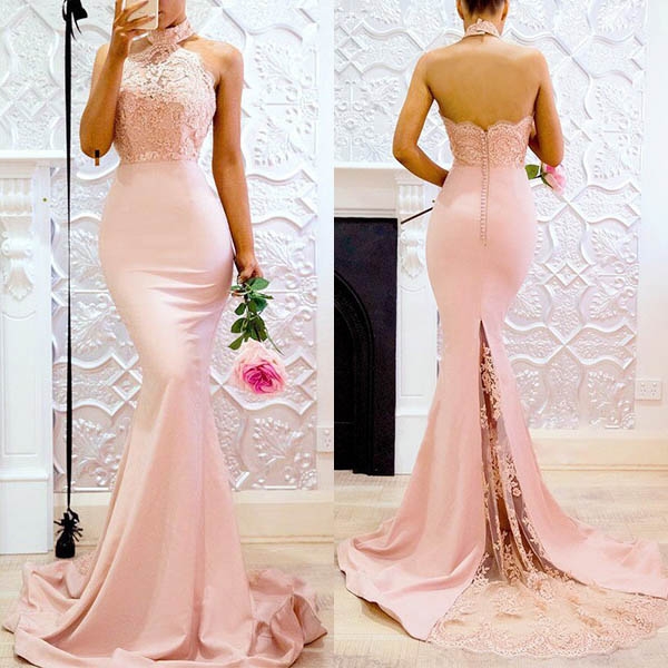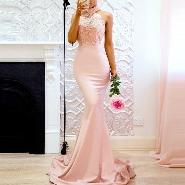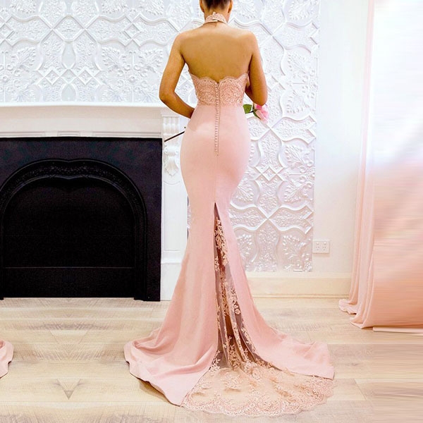 gorgeous dress. Halter style,the backless and lace spliced design will offer you a sexy and alluring look.