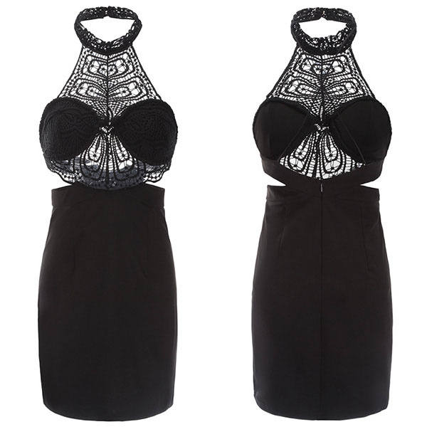 A splash can be aroused once you slip into this alluring dress. Halter style,with backless and lace spliced design,