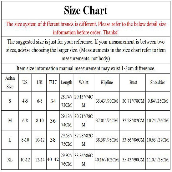 XL : Bust : 90cm(35.43"); Waist : 86cm(33.86"); Hips : 102cm(40.16"); Shoulder : 28cm(11.02"); Length : 76cm(29.92");