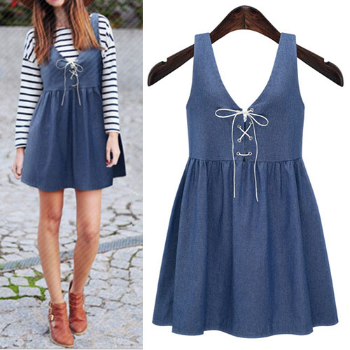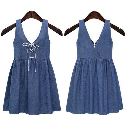 Hey,girls,add a touch of fun and youthful vibe to your wardrobe with this sleeveless denim dress. Its backless and