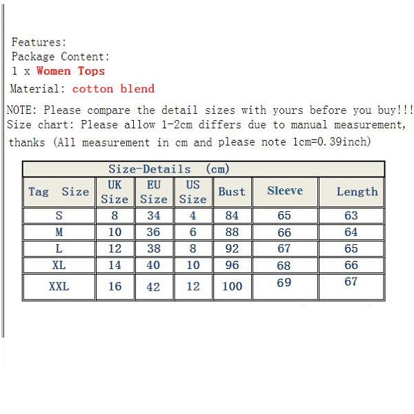 XL : Bust : 96cm(37.8"); Sleeve : 68cm(26.77"); Length : 66cm(25.98");