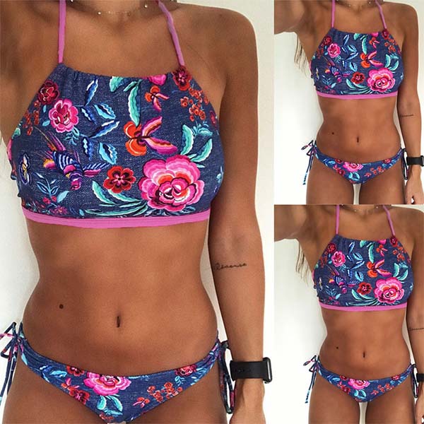 eye-catching printed pattern,including a backless halter bikini top and a low-waist bikini bottom,