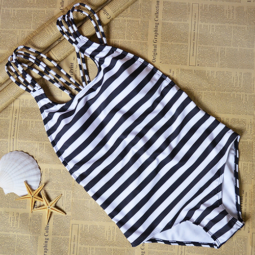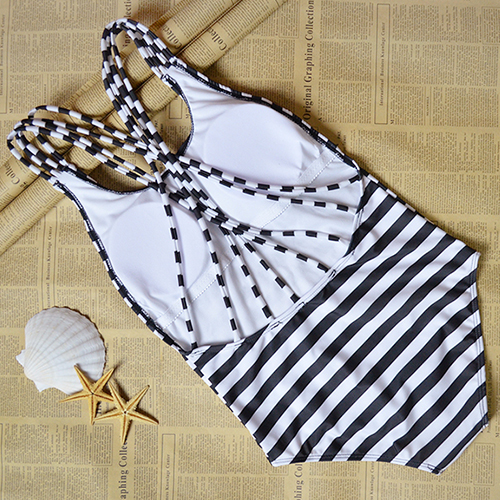 Ride the wave happily with this swimwear. One-piece style,with backless design,and its striped