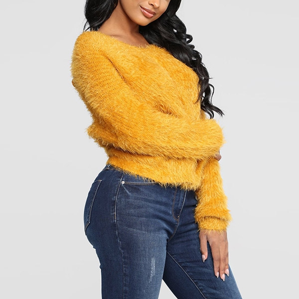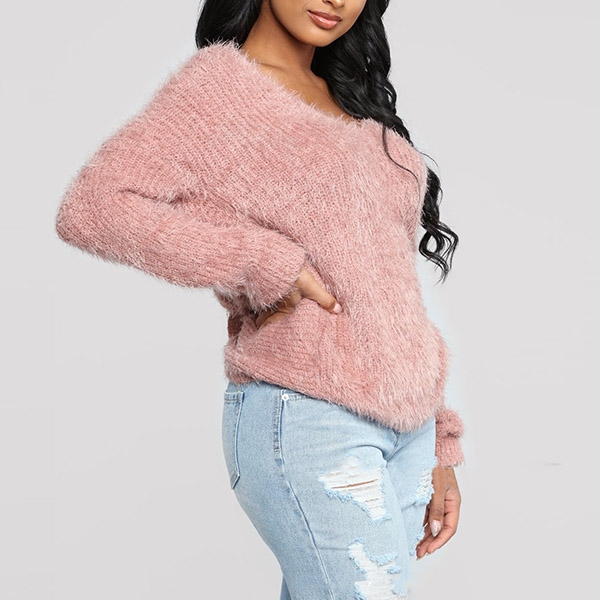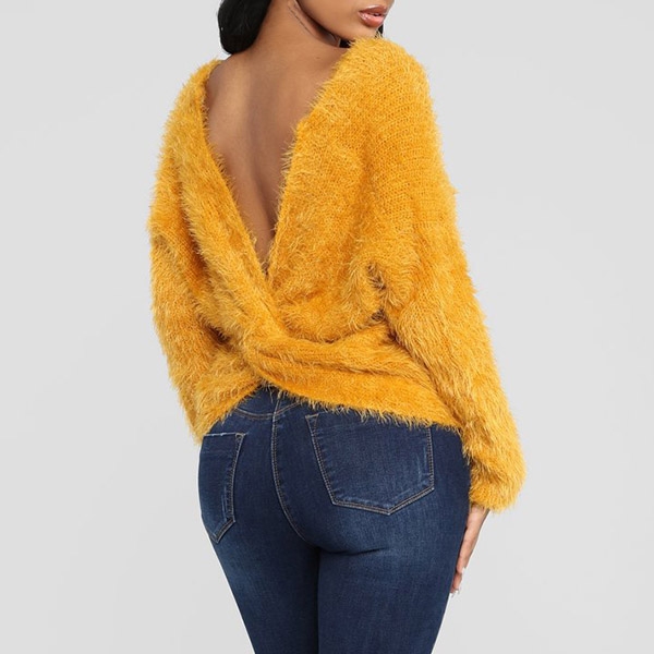 Showcasing a slightly loose silhouette with fluffy fabric, feature V-shape back with twist accent for a sexy adorn,