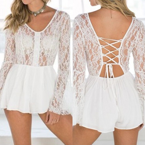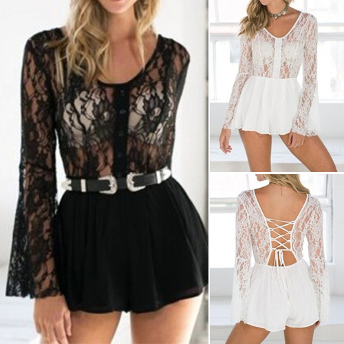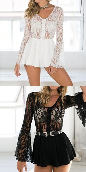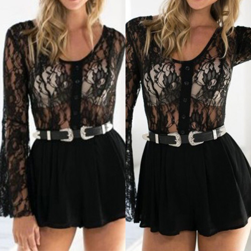 Showcase your charming feminine and sexy style via this romper. See-through lace spliced style,