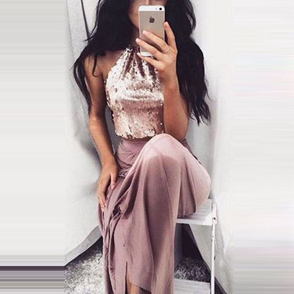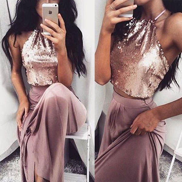 backless sequin crop top and a high waist skirt,sexy and alluring. When invited to a night party,you can trust in