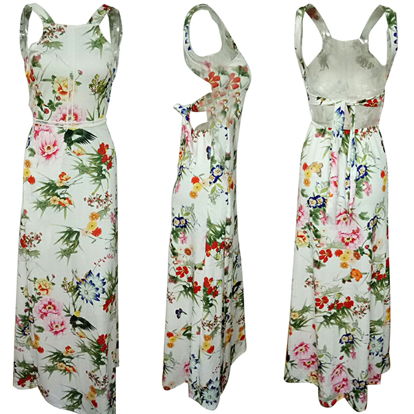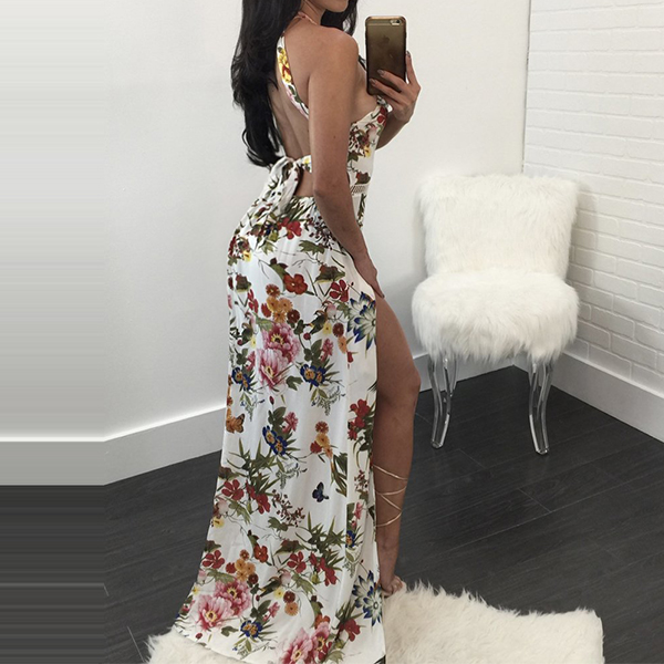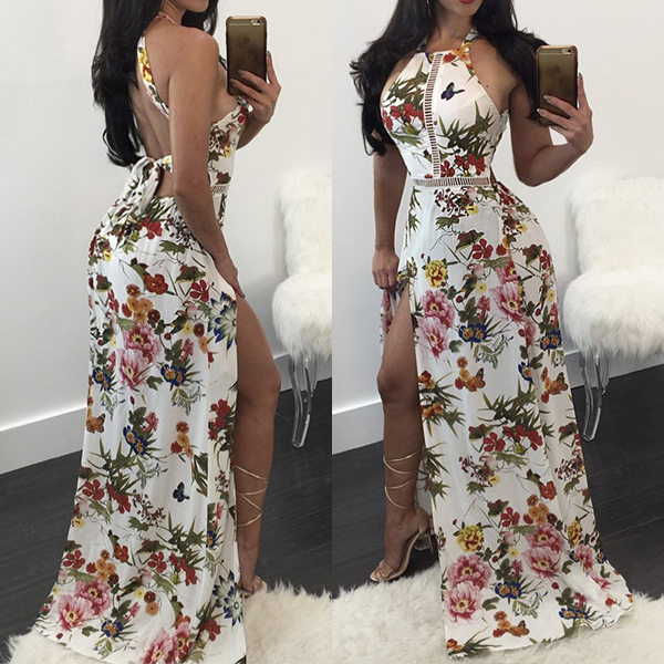 Boasts vibrant floral print,accompanied with backless,high waist,side-slit hem and a maxi length,sexy and alluring.