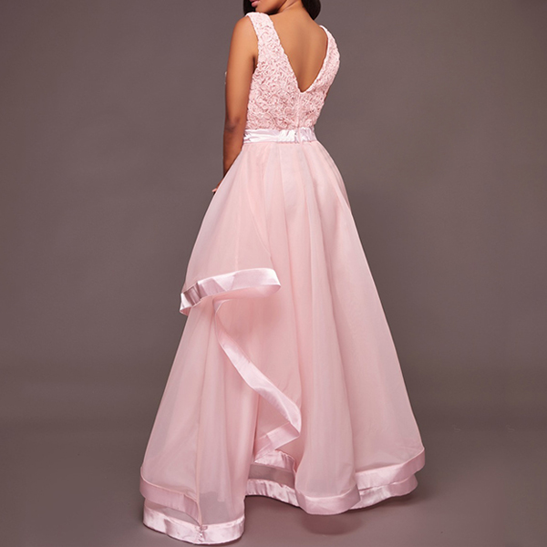 wedding dress. It is styled with v-shaped backless,sleeveless,high waist and lace spliced details,sexy and seductive.