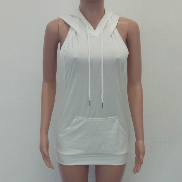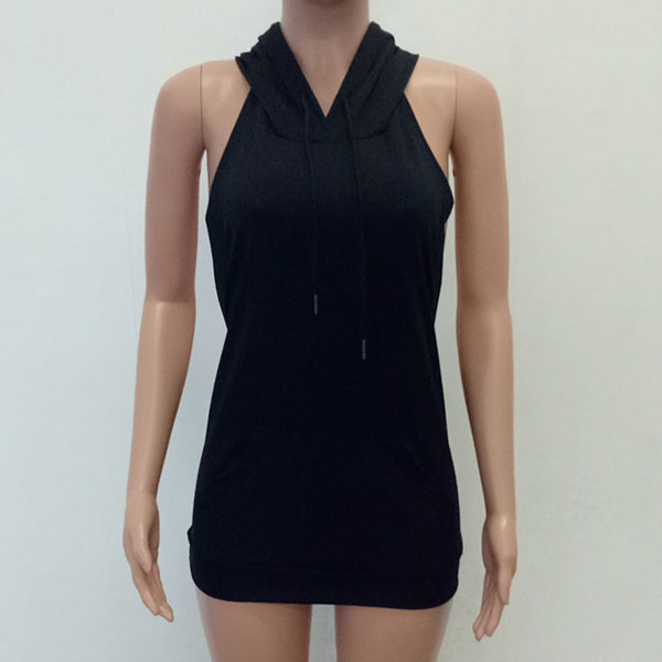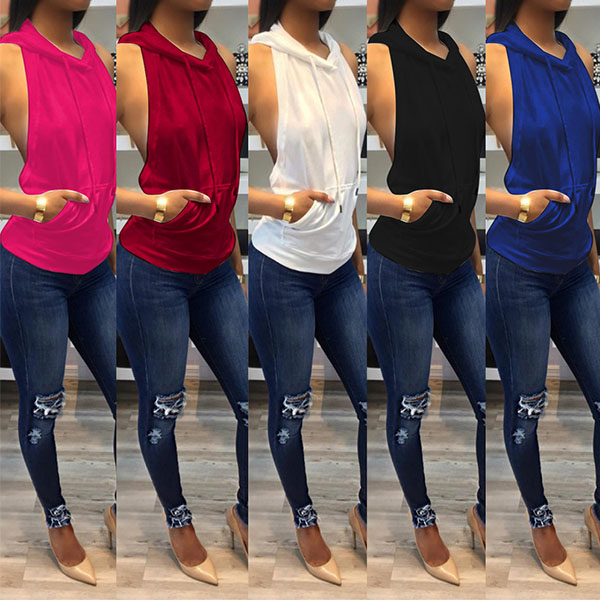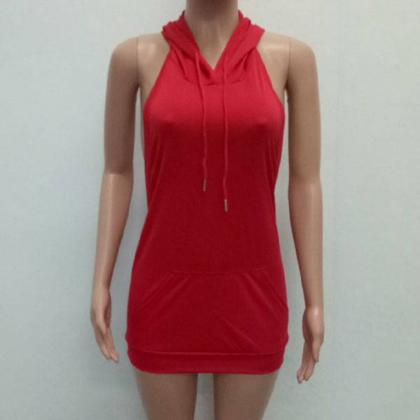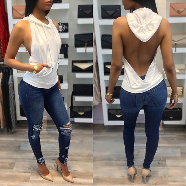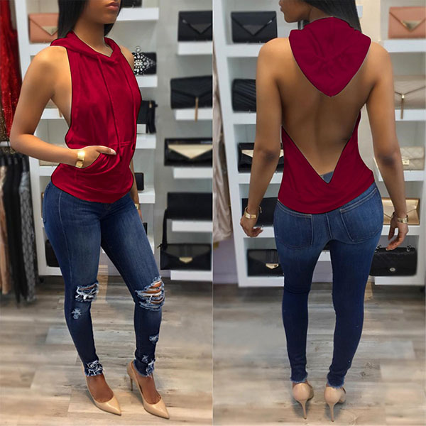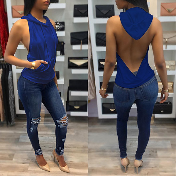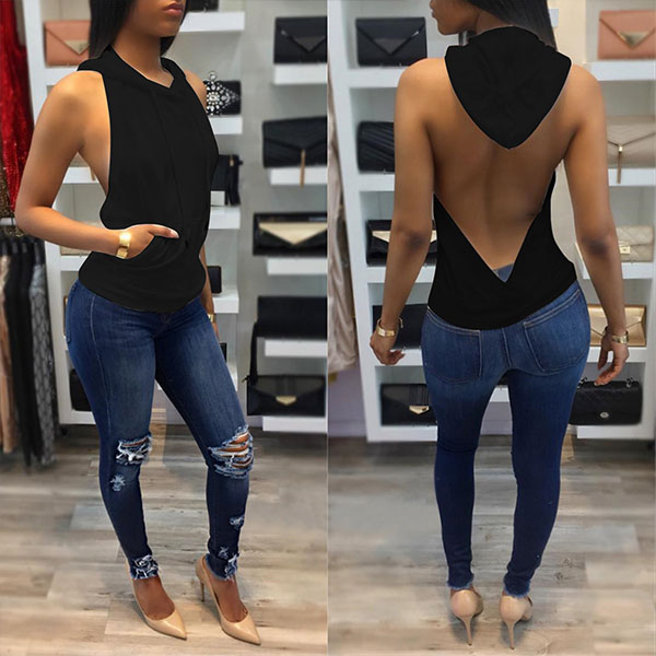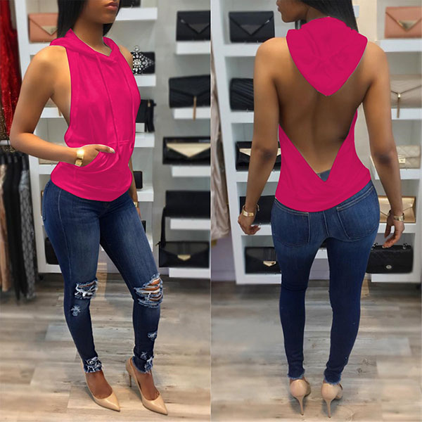 Solid color style,designed with sleeveless,backless,a drawstring hood and a kangaroo pocket,sexy,chic and seductive.
