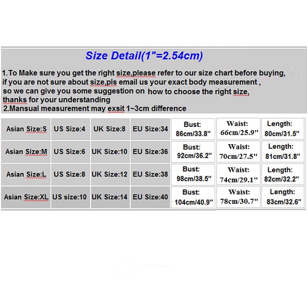 XL : Bust : 104cm(40.94"); Waist : 78cm(30.71"); Length : 83cm(32.68");