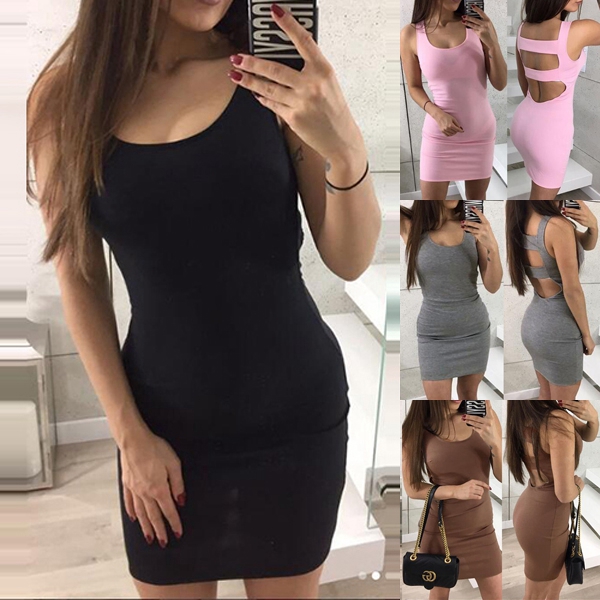 complemented with sleeveless,round neck,backless and a body-flattering silhouette,this dress is the