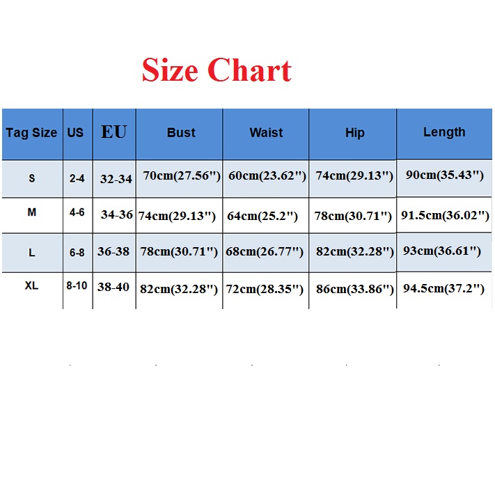 XL : Bust : 82cm(32.28"); Waist : 72cm(28.35"); Hips : 86cm(33.86"); Length : 94.5cm(37.2");