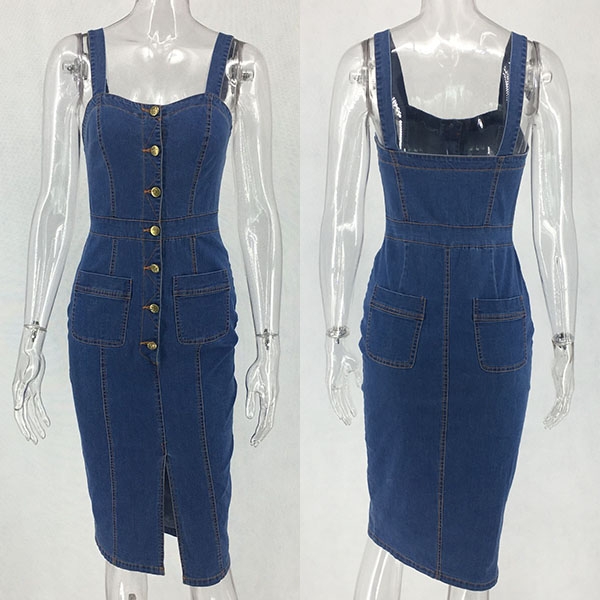 into this denim dress. Sling style,with backless,slit hem and a fit silhouette,this dress can showcase