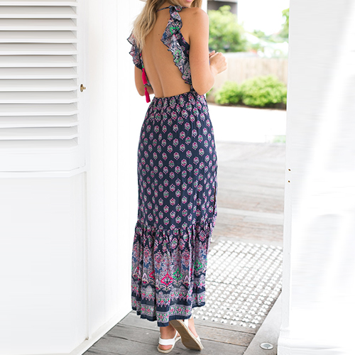 maxi dress is the perfect choice. Boasting a vibrant floral print,its backless and slit hem design makes it look