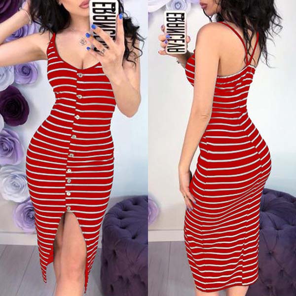 through this striped tight dress. Sling style,the backless and slit hem design can lend you a sexier look,