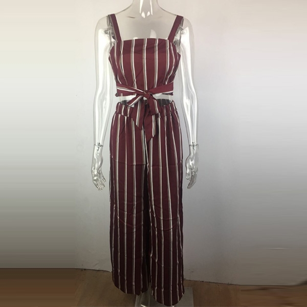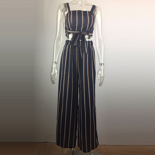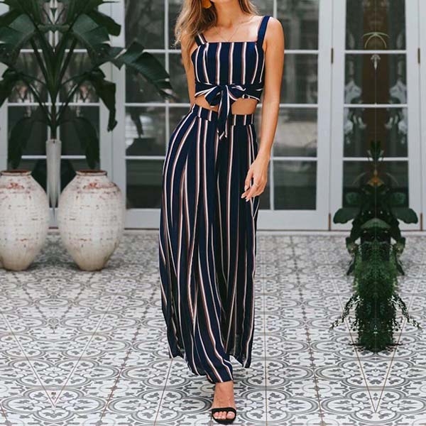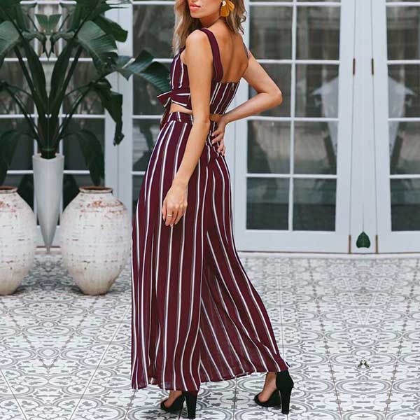 Designed with striped element,including a backless sling crop top and a high waist