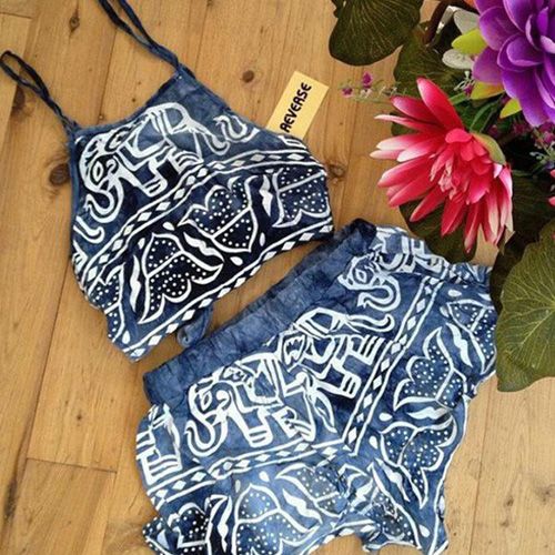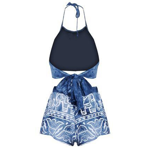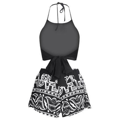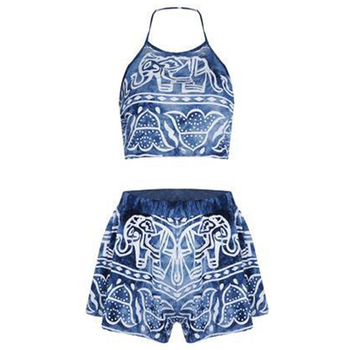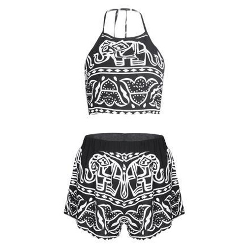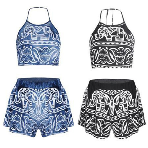Two-piece style,including a backless tops and a shorts. Elephant print pattern design