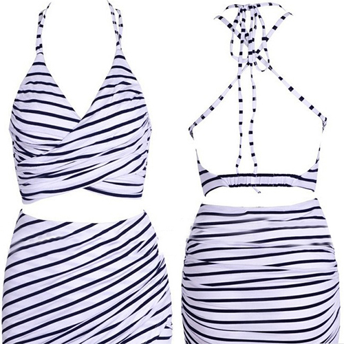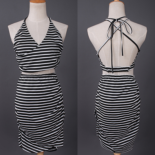 Showcase your charming feminine spirit through this two-piece set. Striped style,including a backless v-neck cam