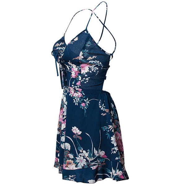 Sling style,boasts vibrant floral print details,with backless and v-neck design,this relaxed