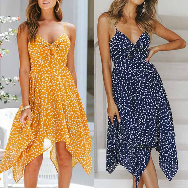 with backless,v-neck,irregular hem and dot printed details,this dress is sure to know how to express
