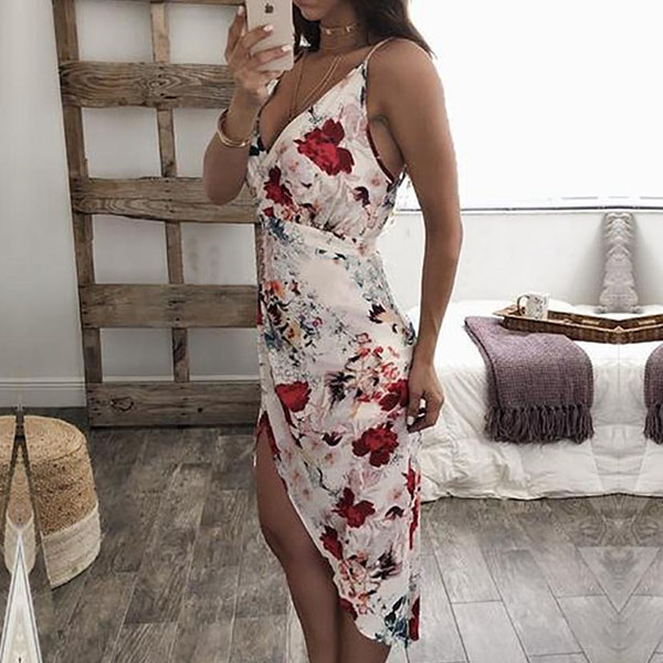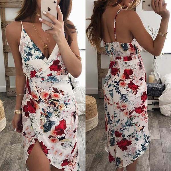 This dress boasts vibrant floral print,with backless,v-neck and irregular hem,this dress not only can help