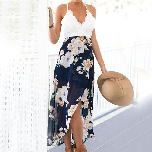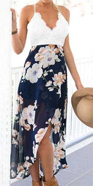 deep v-neckline,lace spliced and irregular printed hem make this number look so feminine and