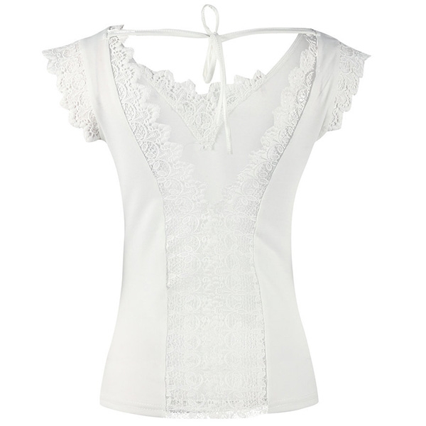 This t-shirt boats a solid color,the backless,v-neck and lace spliced design will make it look more attractive