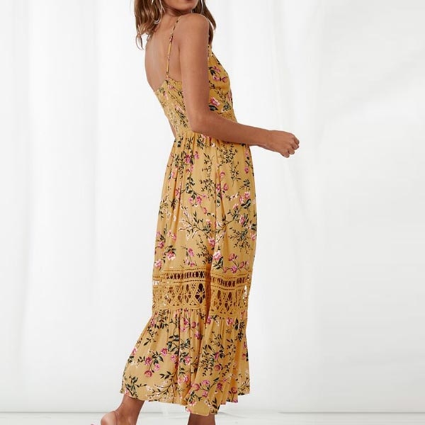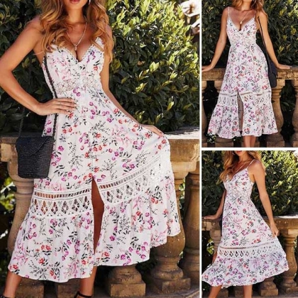 coming with vibrant floral print details,the backless,v-neck,slit hem and lace spliced design