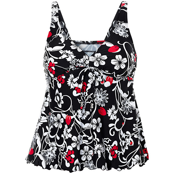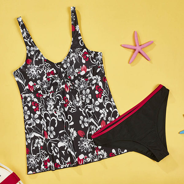 v-neck printed top and a black low-waist panty,this swimsuit set will lend you an appealing beach look.