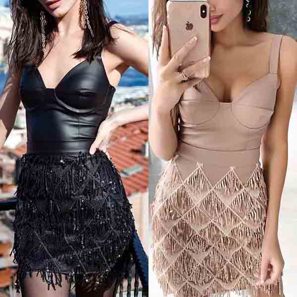 Sexy Backless V-neck Sequin Tassel Spliced Sling Dress(It falls small)