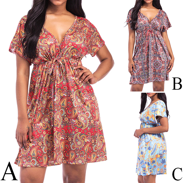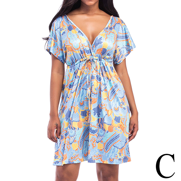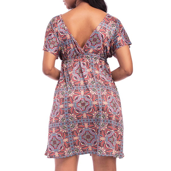Features chic and eye-catching printed pattern,outfitted with v-shaped backless,v-neck,short sleeve and high waist design,